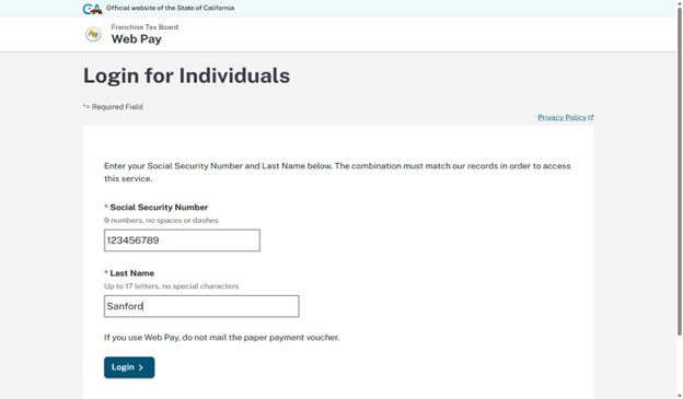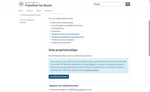 - Go to https://www.ftb.ca.gov/pay/bank-account/index.asp and click “Use Web Pay personal” at the bottom of the page.