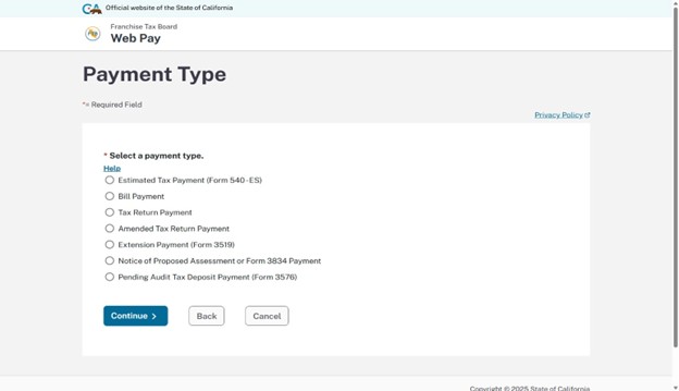 4. The next page will have you filling out what kind of payment you are making. If you are paying the balance due to California select “Tax Return Payment. If you are making your California estimated payments, select “Estimated Tax Payment (Form 540-ES)”.