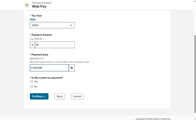 5. Enter the tax year you are making your payment for, the payment amount, and what date you would like the payment to go through. If you are Married Filing Jointly, select Yes under “Is this a joint tax payment?”. Otherwise, select No.