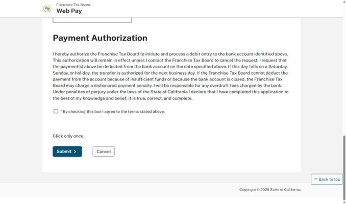 8. Agree to the Payment Authorization and submit. Your FTB payment should be good to go!